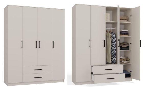 Szafa Czterodrzwiowa Duża Garderoba 2 Szuflady Regał 205x160cm Kaszmir Beż
