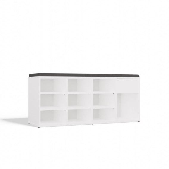 Szafka na buty TALLIN to funkcjonalne i estetyczne rozwiązanie do każdego przedpokoju, które łączy komfort siedzenia z dużą ilością miejsca do przechowywania. Biała bryła o lekkim, nowoczesnym wyglądzie została wzbogacona o tapicerowane siedzisko, zapewniając wygodę podczas zakładania obuwia. Mebel wyposażony został w aż 9 otwartych przegród na buty, szufladę na drobiazgi oraz wysoką komorę, w której z łatwością zmieścisz wyższe obuwie lub akcesoria.